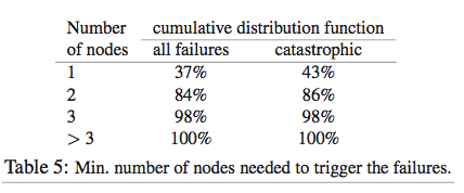 Table 5 shows that almost all (98%) of the failures are guaranteed to manifest on no more than 3 nodes, and 84% will manifest on no more than 2 nodes. For large-scale distributed systems, 3 nodes being sufficient to manifest almost all failures seems surprisingly low. Of course, this paper looks at data-intensive distributed systems, which may not be representative of general distributed systems. In any case, these numbers don't surprise me as they agree with my experience using TLA+ in verifying distributed algorithms.