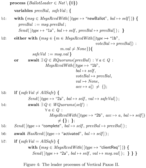 The leaders’ code is in Figure 4 and the master’s code is in Figure 5. The big simplification here is that, the leader assumes that prevBal is the next lower ballot number. It does not need to search for a complete ballot as in Vertical Paxos I. Just go to the previous active ballot and you are done.