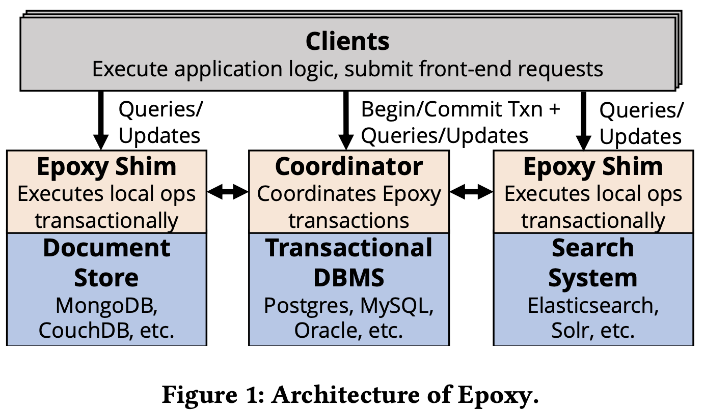 Ok, what is this Epoxy work about? Epoxy leverages Postgres transactional database as the primary/coordinator and extends multiversion concurrency control (MVCC) for cross-data store isolation. It provides isolation as well as atomicity and durability through its optimistic concurrency control (OCC) plus two-phase commit (2PC) protocol. Epoxy was implemented as a bolt-on shim layer for five diverse data stores: Postgres, MySQL, Elasticsearch, MongoDB, and Google Cloud Storage (GCS). (I guess the authors had Google Cloud credits to use rather than AWS credits, and so the experiments were run on Google Cloud.)